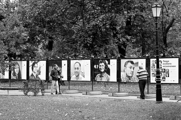 Фотовыставка «Люди особого назначения» открылась в столичном Саду им. Баумана 16 сентября. Недалеко от главного входа, на аллее, ведущей от цветника к теннисному корту, разместились 20 гигантских стендов, с которых на посетителей глядят лица: мужские и женские, веселые и сосредоточенные, но главное — всех их объединяет одна идея, одно решение.