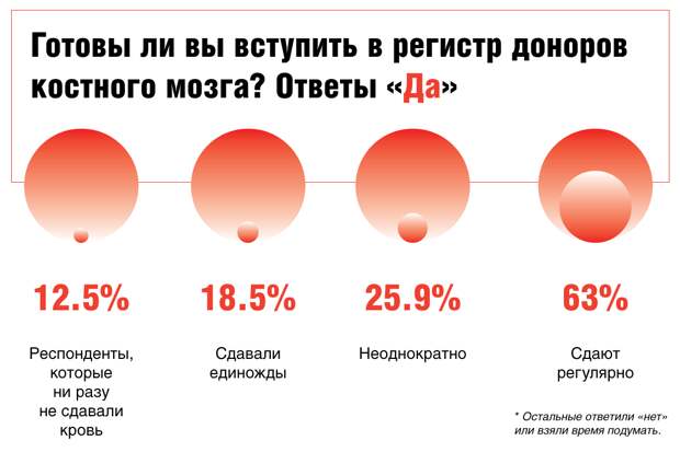 Спросили мы у всех 73 человек, готовы ли они вступить в регистр доноров костного мозга, – 33,9% ответили согласием. То есть каждый третий. Когда мы задавали тот же вопрос людям, ни разу не сдававшим кровь, то согласились стать донорами костного мозга 12,7% человек, то есть в 2,6 раза меньше. Теперь разберемся подробнее. Из этих 73 человек 27 сдавали кровь единожды, 27 – неоднократно, 19 – сдают регулярно, то есть стали донорами на постоянной основе. И тут мы выявили довольно однозначную зависимость ответов «да» и частоты сдачи крови. Из первых 27 согласились стать донорами костного мозга 5 (18,5%), из вторых 27, сдавших кровь больше одного раза, – 7 (25,9%) человек, а из 19, сдающих кровь постоянно, 12 ответили «да», то есть 63% готовы стать донорами костного мозга.